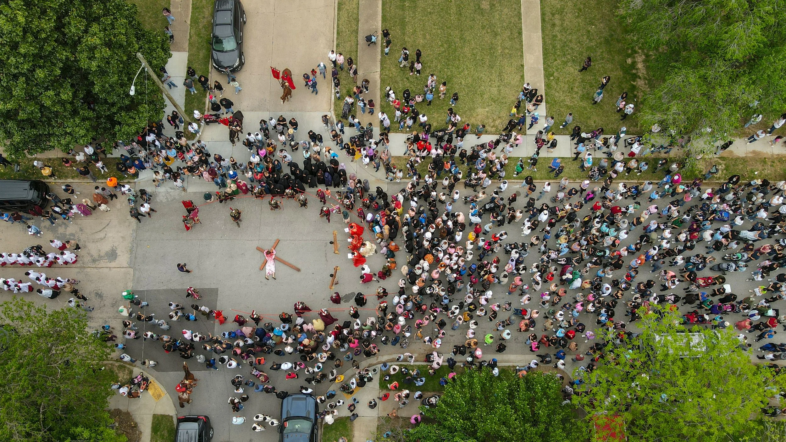 Worshippers surround an actor portraying Jesus as he falls with his cross on 1st Street and Birmingham Ave. during St. Francis Xavier Catholic Church’s Stations of the Cross procession Friday, April 18, 2025 in Tulsa, Ok.