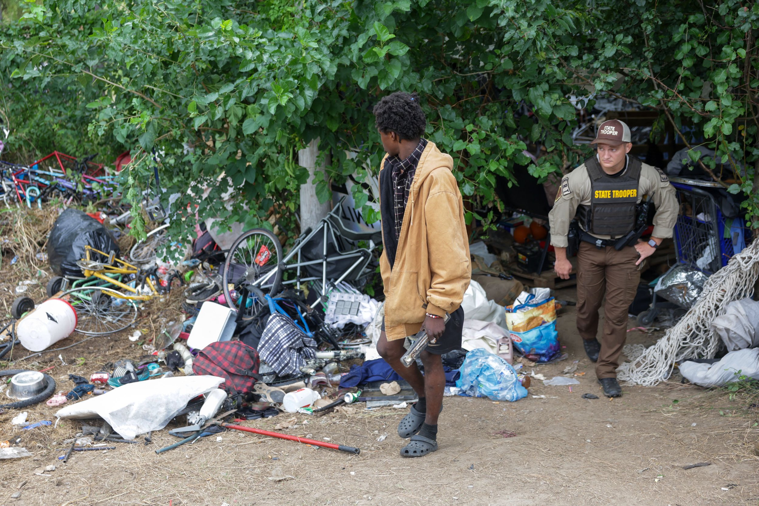A man named Savage works to salvage items from a friend’s camp as state troopers with Oklahoma Highway Patrol oversee the clearing of an encampment Friday, Sept. 5, 2025 in Tulsa, Okla.