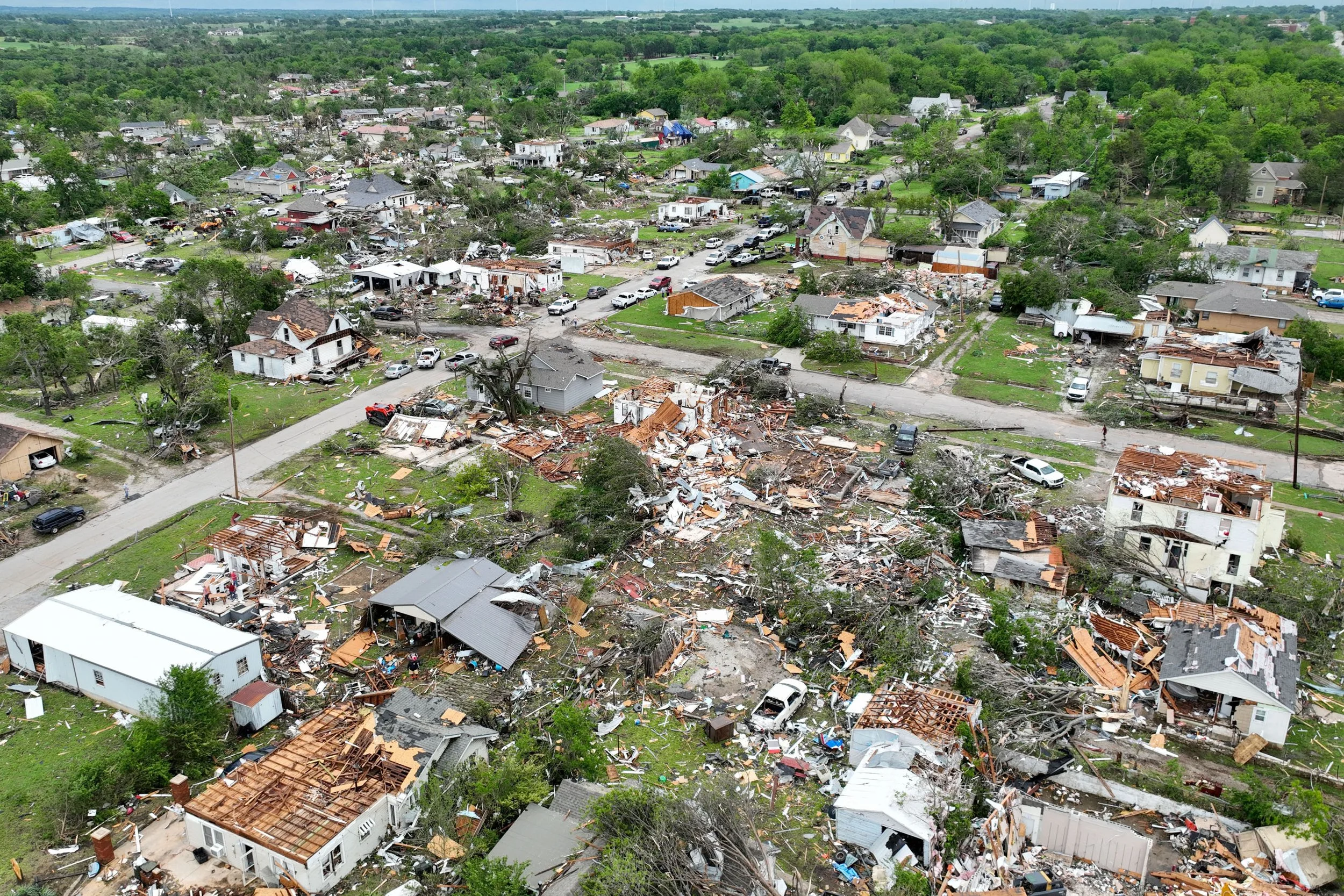 An aerial view of storm damage Thursday, May 9, 2024 in Barnsdall, Ok. If you look to the horizon the path of the tornado is visible.